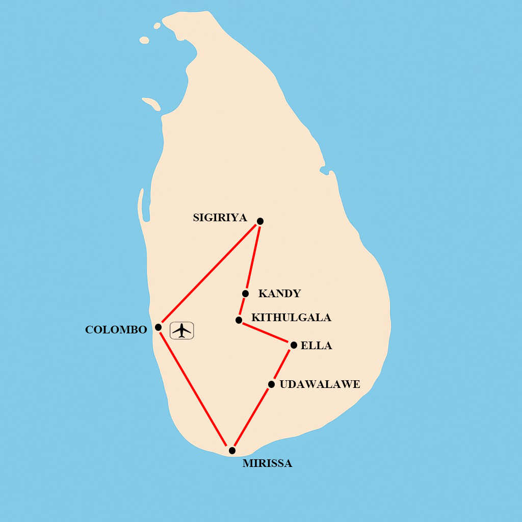 - Destinations: Colombo, Dambulla, Sigiriya, Kandy, Kitulgala, Ella, Udawalawe, Mirissa, Galle