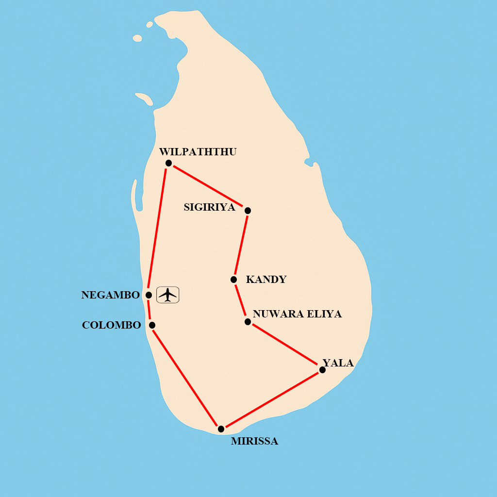 - Accommodation: Negombo hotel; Safari lodge near Wilpattu; Hotel Sigiriya; Kandy hotel; Nuwara Eliya hotel; Safari lodge near Yala; Mirissa hotel; Colombo hotel